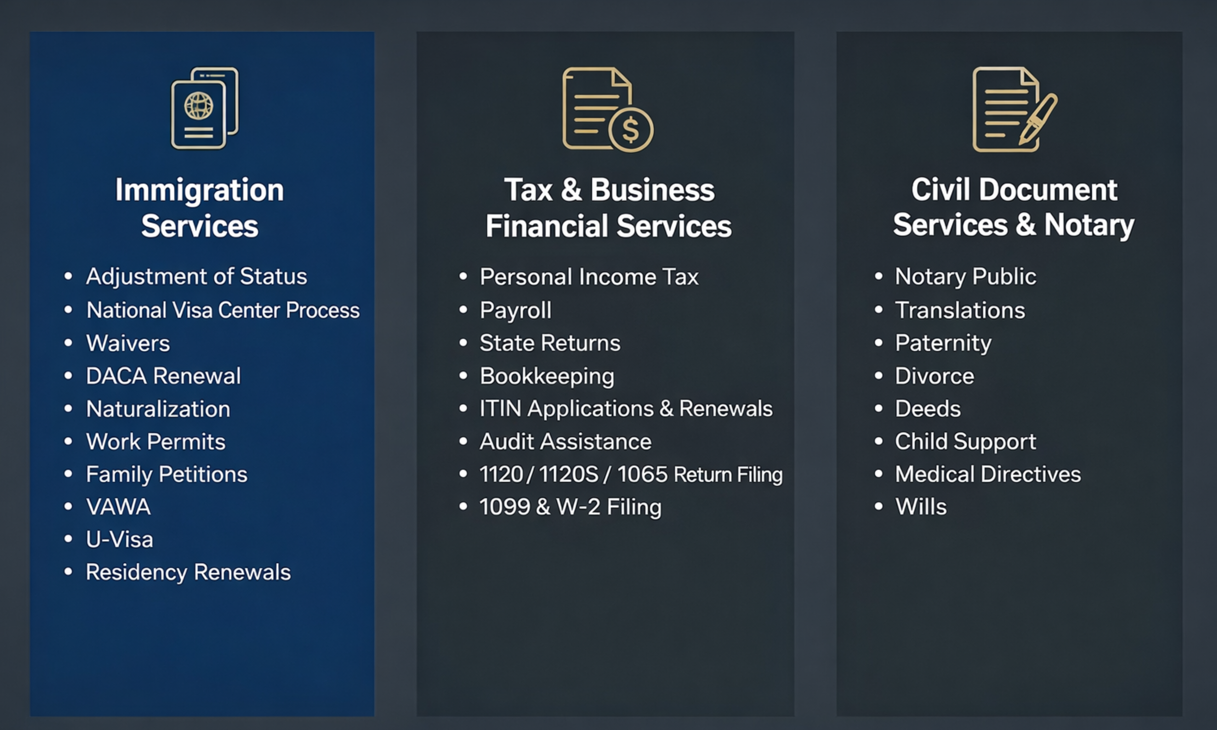 Whether you prefer a face-to-face consultation at our physical location or require the convenience of our remote options, we are dedicated to providing seamless, expert support for your immigration, tax, and civil document needs. Our goal is to ensure your essential paperwork is handled with precision and care, regardless of how you choose to connect with us.